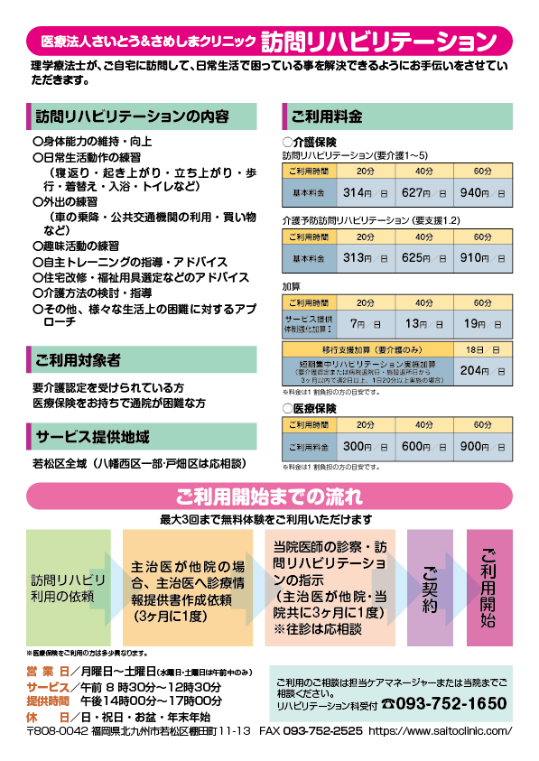 だれでもご利用できます。介護認定を受けている方は、担当のケアマネージャーにご相談ください。介護認定を受けていない方は、リハビリテーション科スタッフへご相談ください。介護疲れや、仕事が忙しい方で通院困難な方も(医療)訪問リハビリの対象となります。会社の労災予防対策また福利厚生の一環としてのご利用もどうぞ。